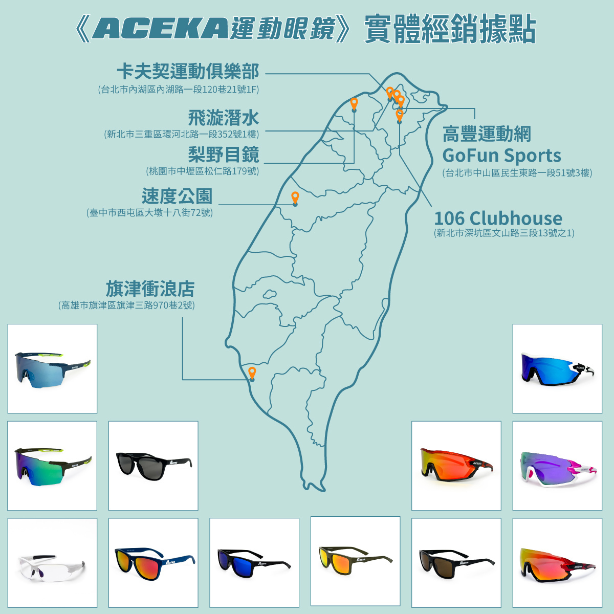 感謝您對ACEKA運動眼鏡的支持與喜愛!我們很高興地宣布,現在您可以在以下合作經銷商購買我們的產品:屋子WUZ、織步加walkplus、旗津衝浪店、Craftzy Sports Club 卡夫契運動俱樂部、飛漩潛水、高豐運動網 GoFun Sports。